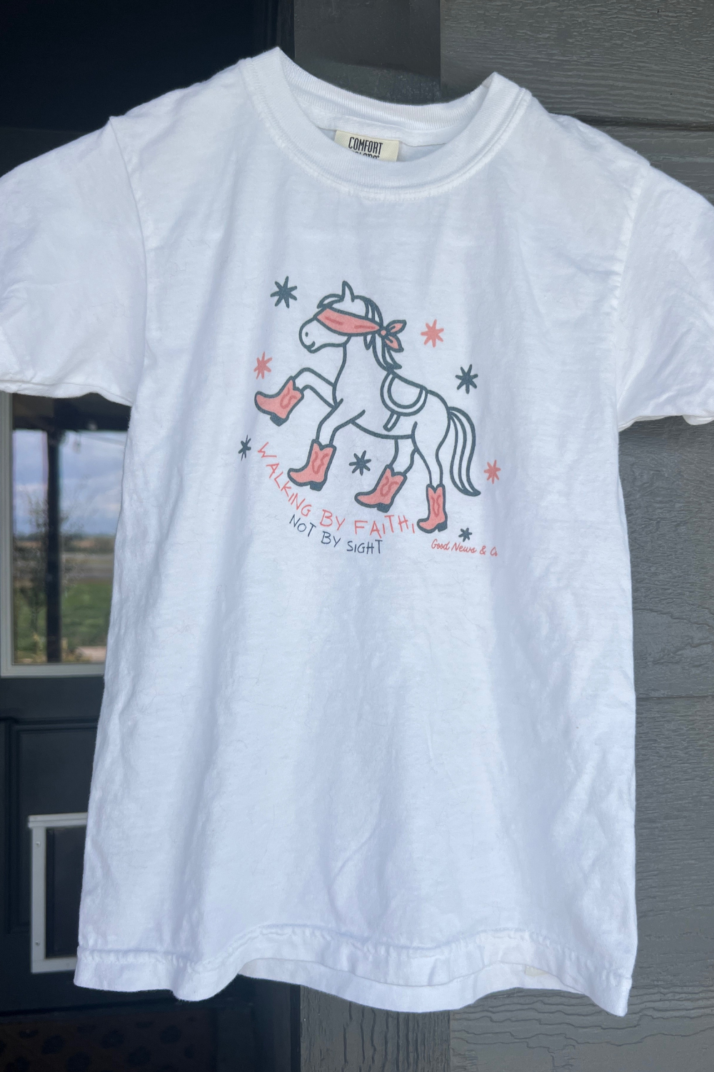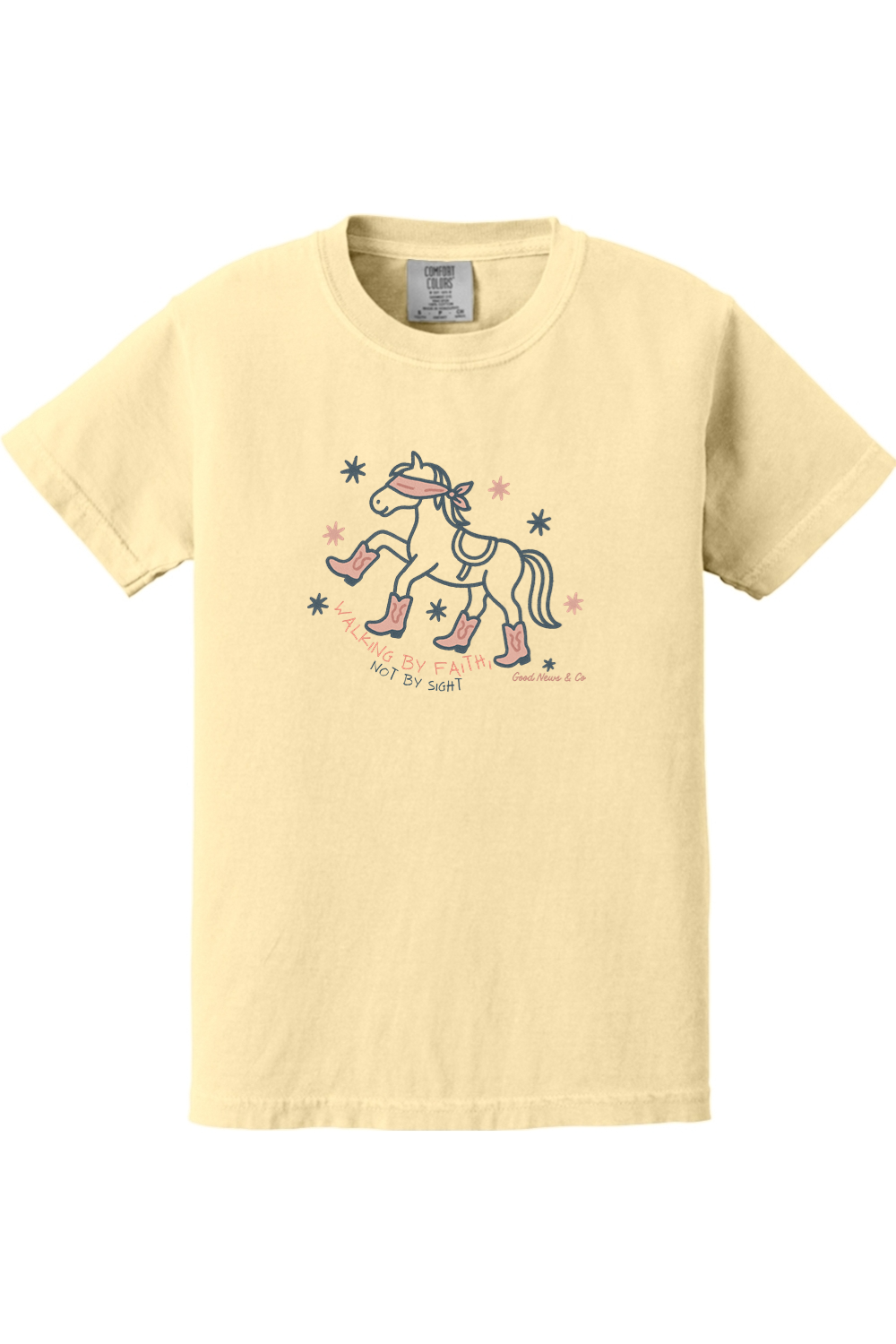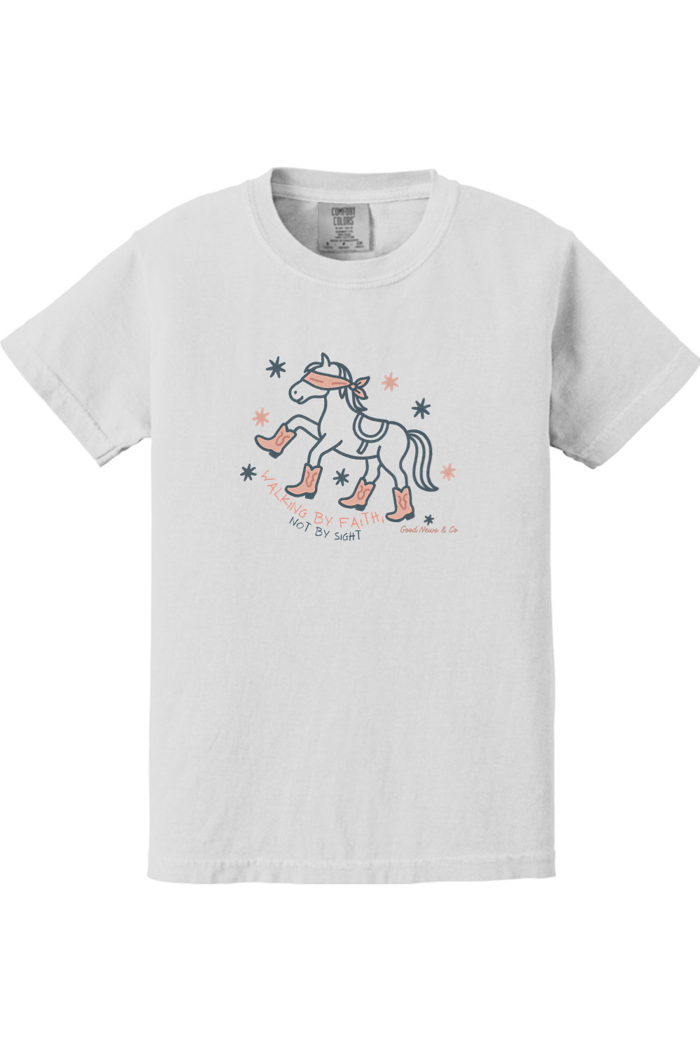 Faith meets cowgirl charm in the Walking by Faith, Not by Sight Girls Tee. Inspired by 2 Corinthians 5:7, this Christian youth t-shirt features a playful design of a blindfolded horse wearing cowgirl boots, bringing the message of walking by faith, not by sight, to life in a fun and stylish way.