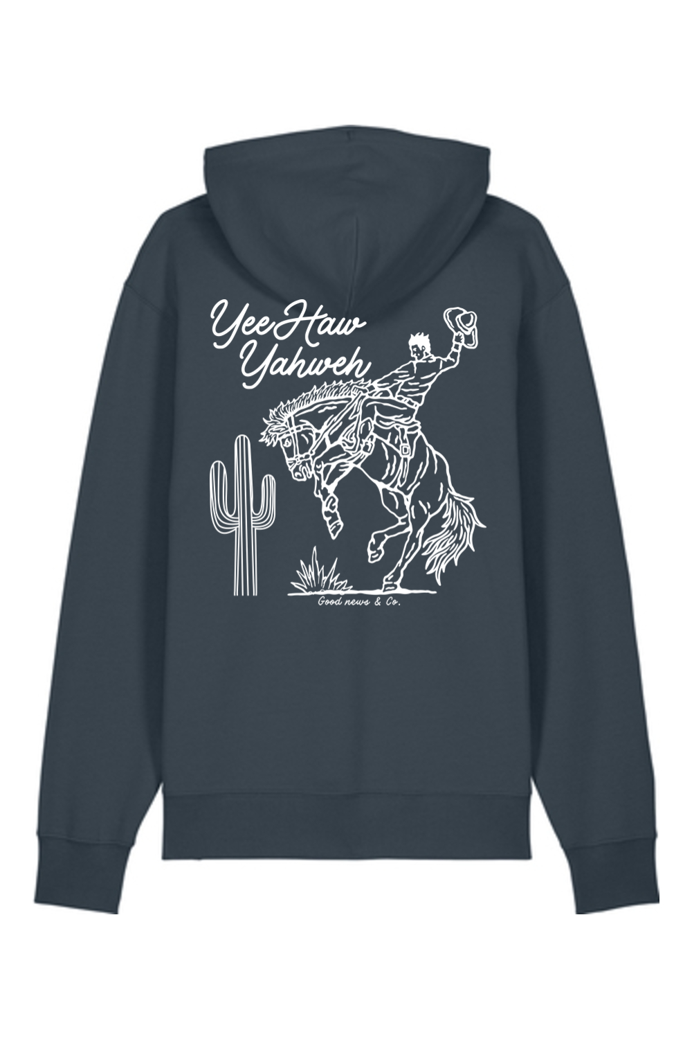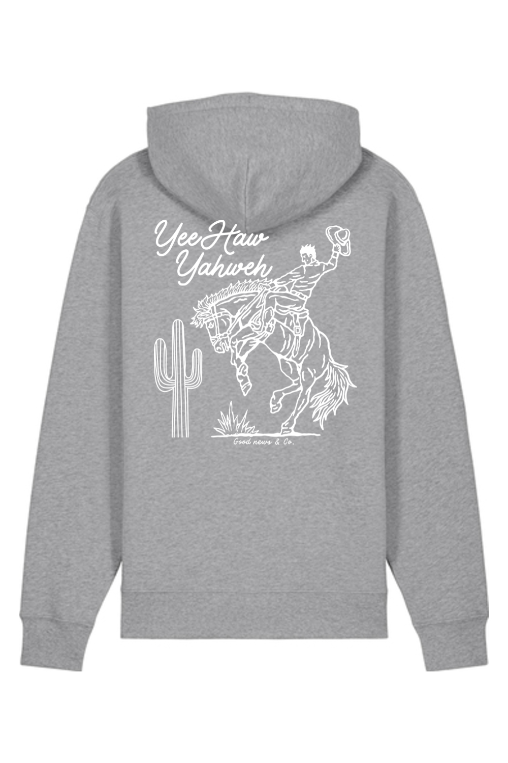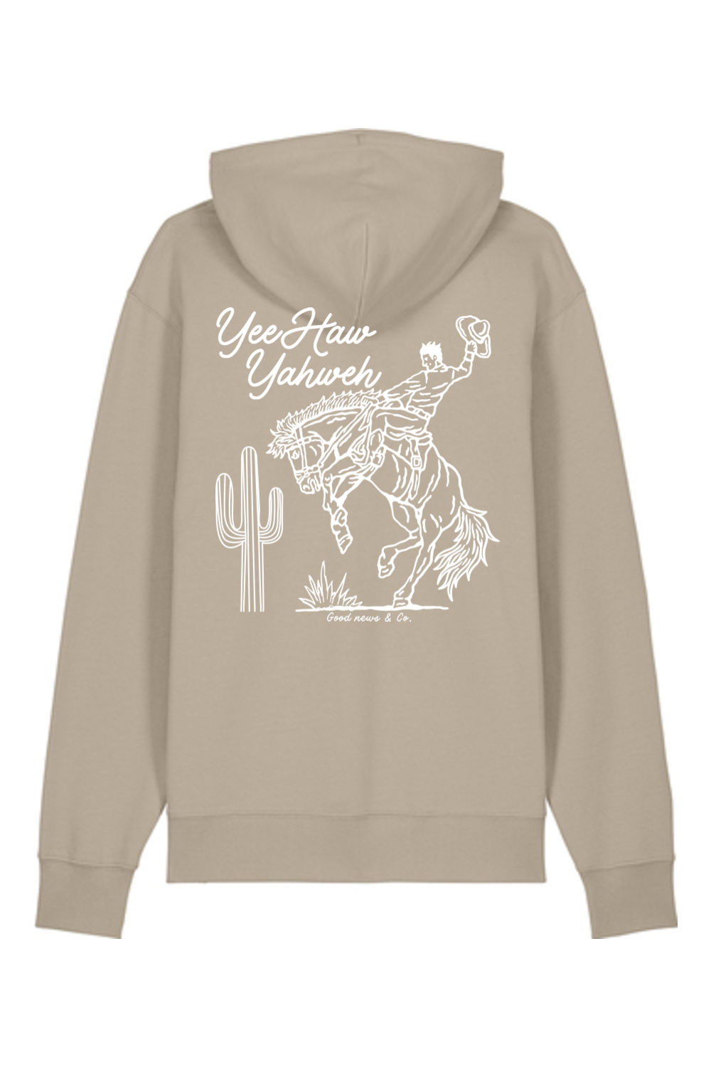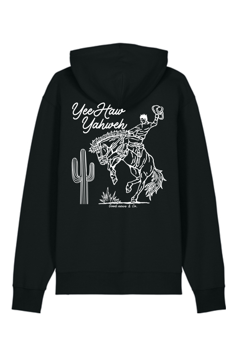 Celebrate your faith in this western inspired YeeHaw Yahweh unisex hooded sweatshirt. Crafted from high-quality material, this cozy sweatshirt combines comfort with a bold Christian message, God is with you where ever life takes you. Perfect for sparking conversations and showing off your unique style, wear your beliefs proudly wherever you go.